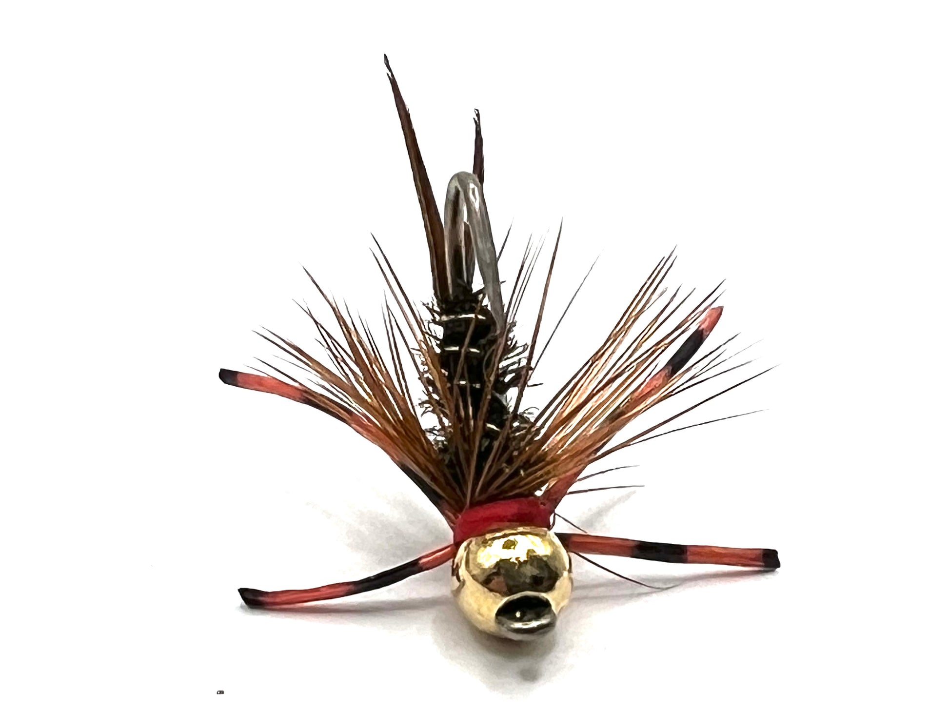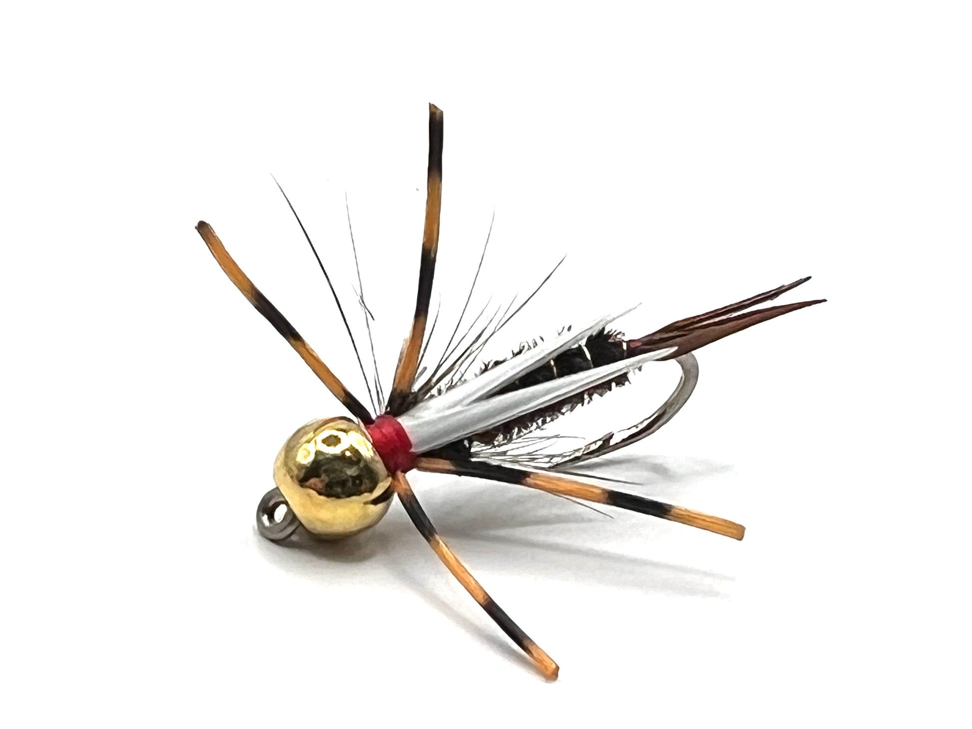 A Variation of a classic. These size 10 Prince Nymphs were made with gold tungsten beads and MFC Sexi-floss rubber legs