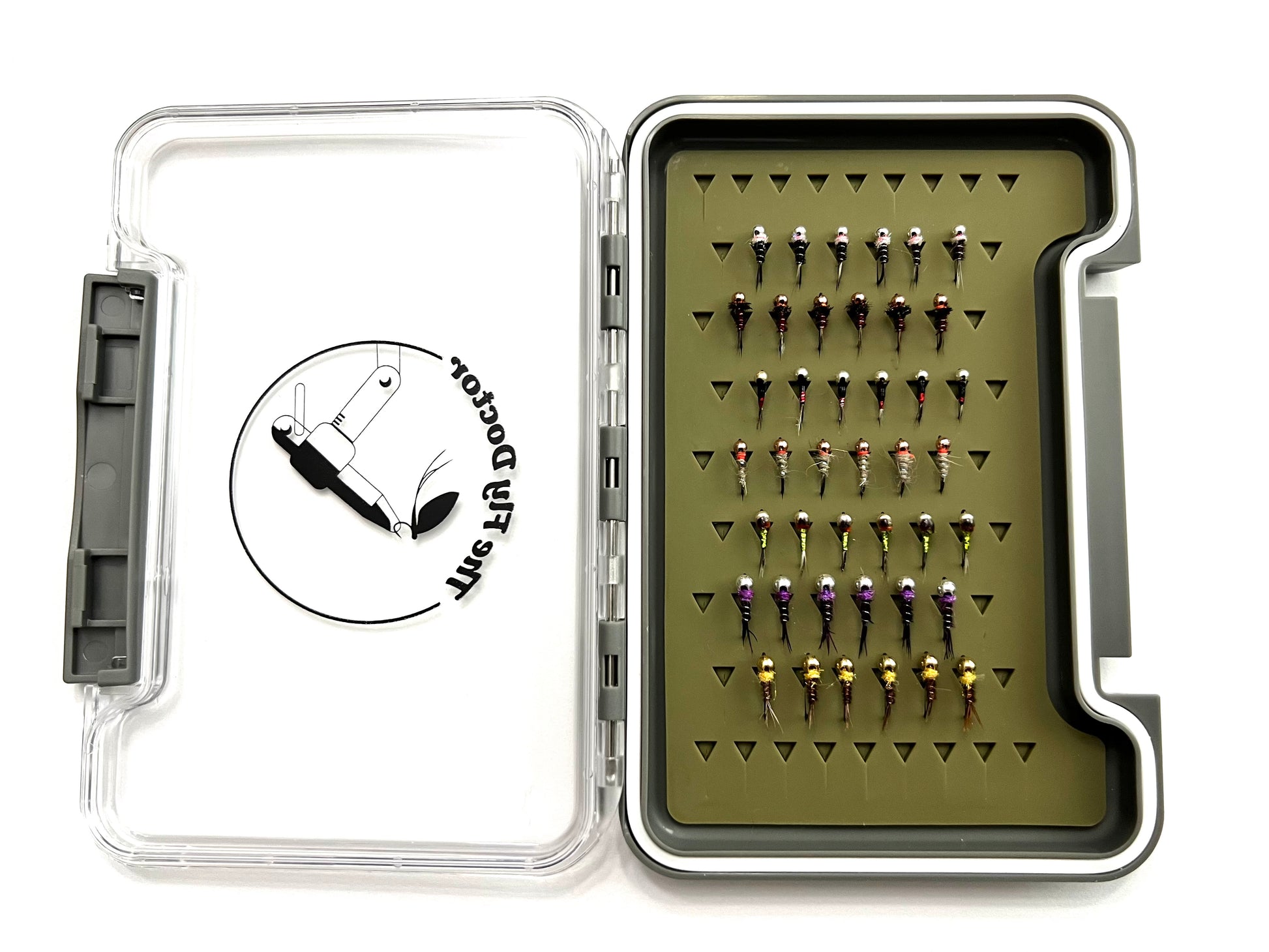 This 5.35 x 3.75 x 0.6" waterproof silicone slim nymph fly box was designed by a master fly fisher for those who want to have some of the most effective subsurface fly patterns to fish in a dry-dropper rig or by themselves. The following 42 nymphs feature tungsten beads and barbless jigged hooks: