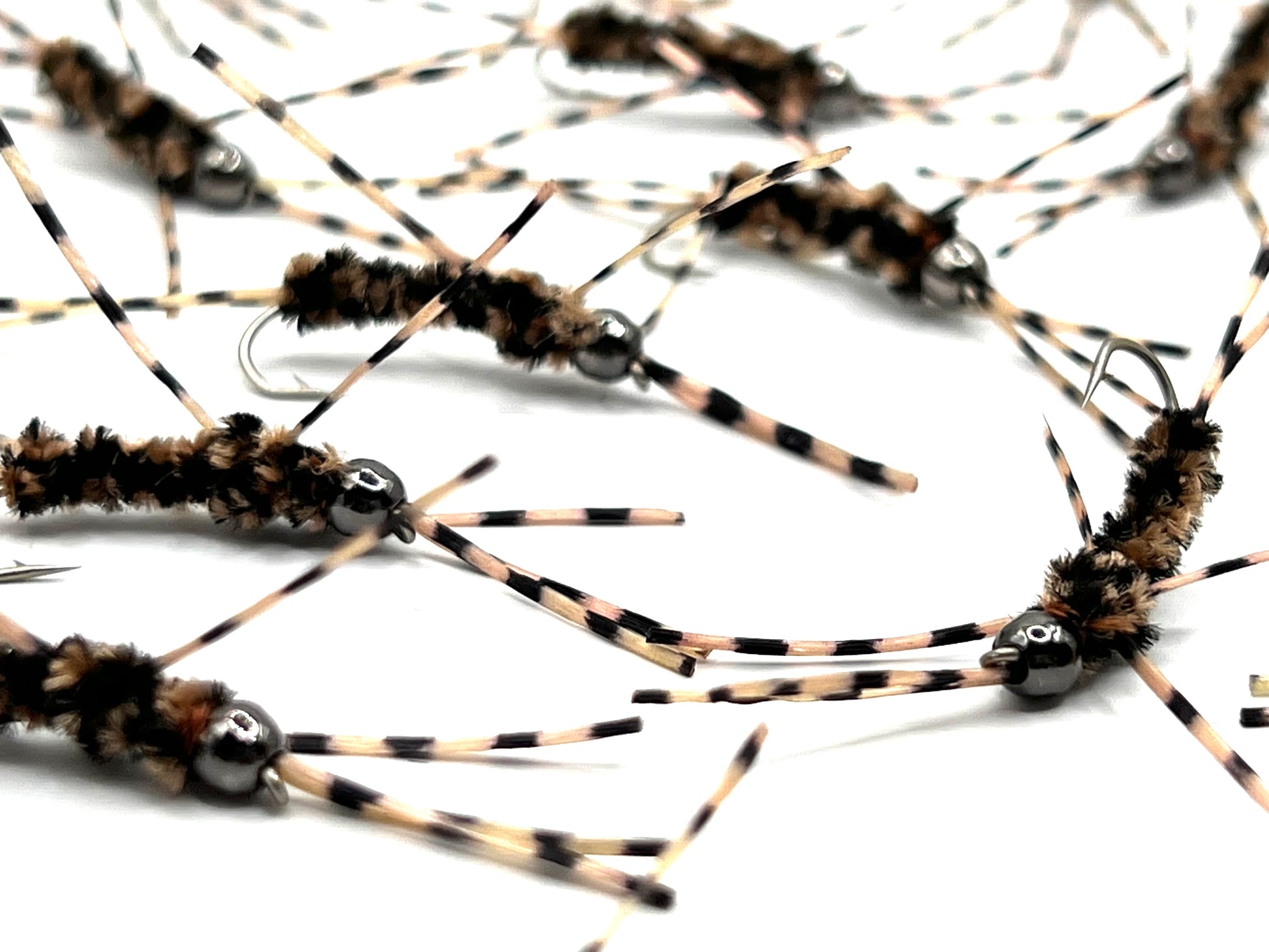 These size 10 Stoneflies are made with 4mm black nickel tungsten beads, tan MFC Sexi-floss legs, and barbed hooks