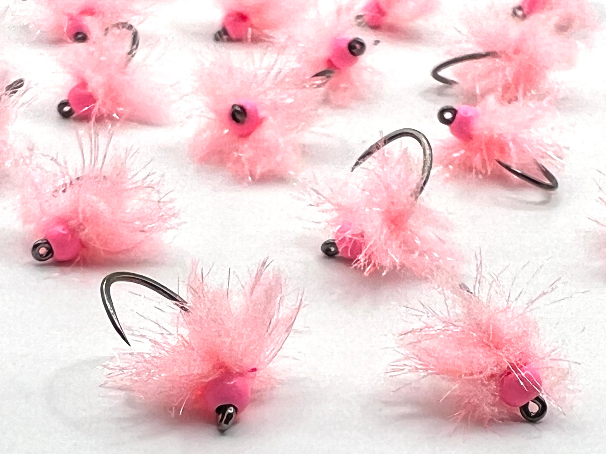 These size 12 “Fire Pink” Eggs were made with salmon pink tungsten beads and barbless hooks