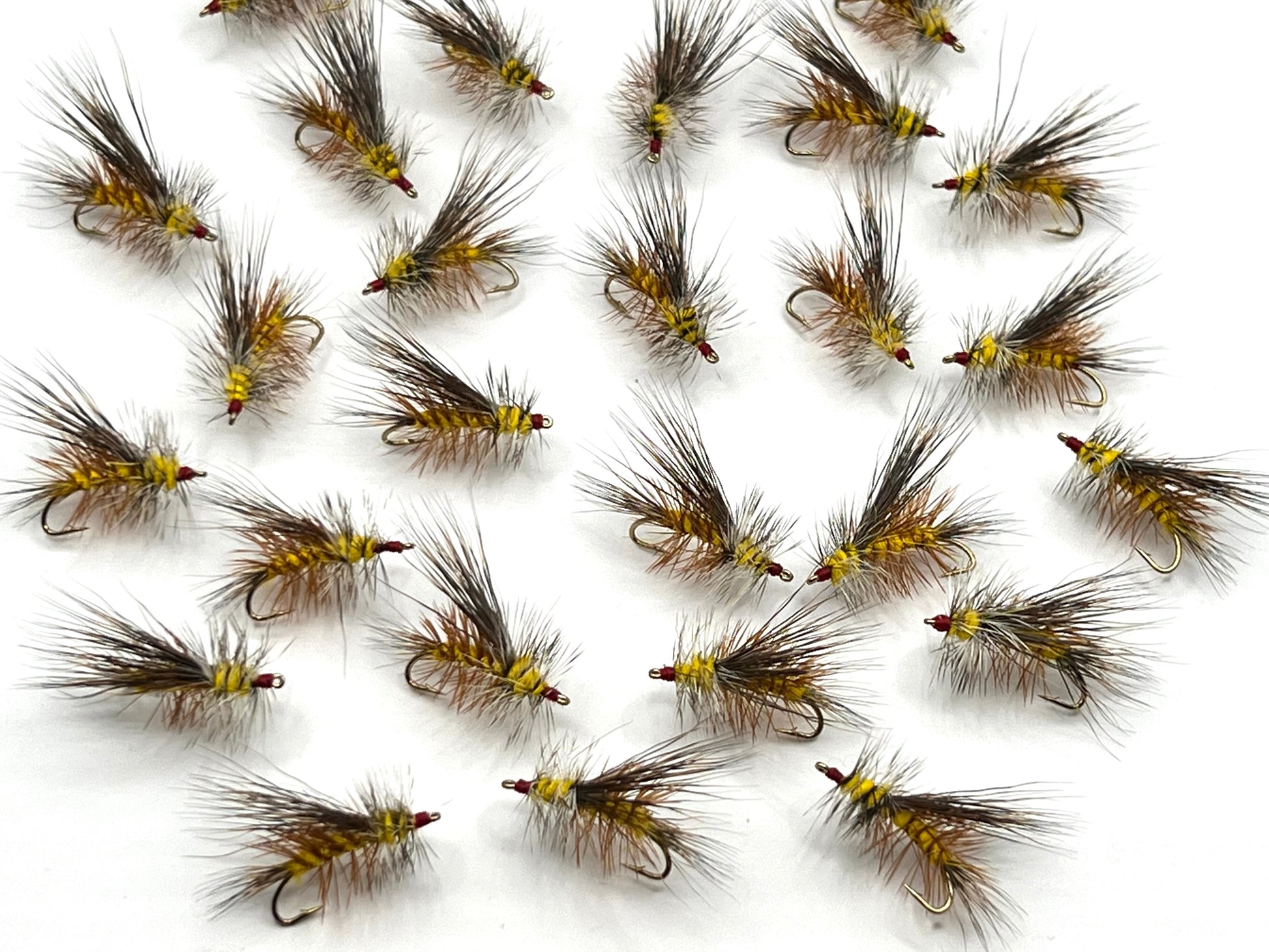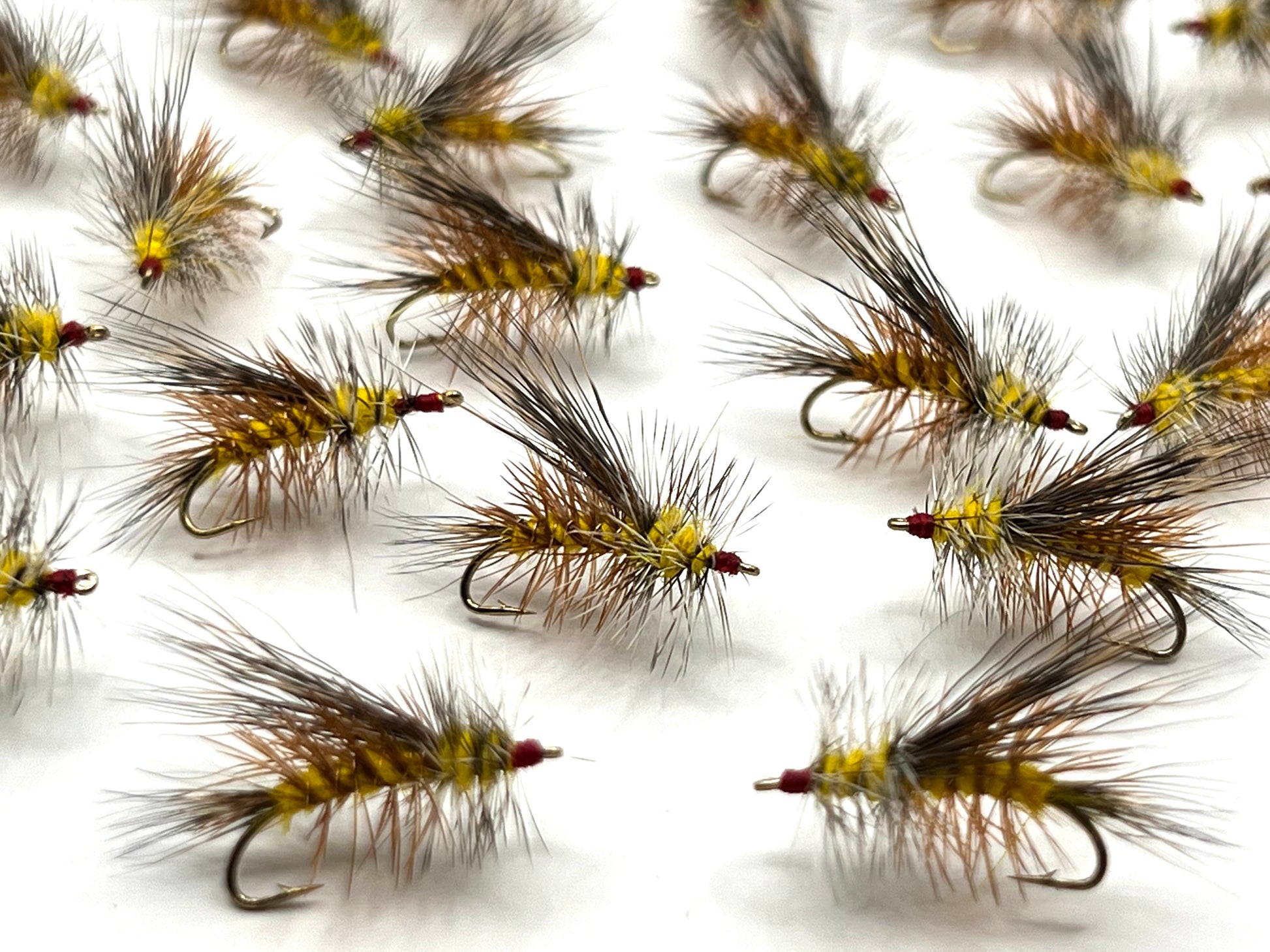 These size 14 yellow Stimulators feature premium whiting grizzly saddle hackle and Nature's Spirit Stimulator deer hair