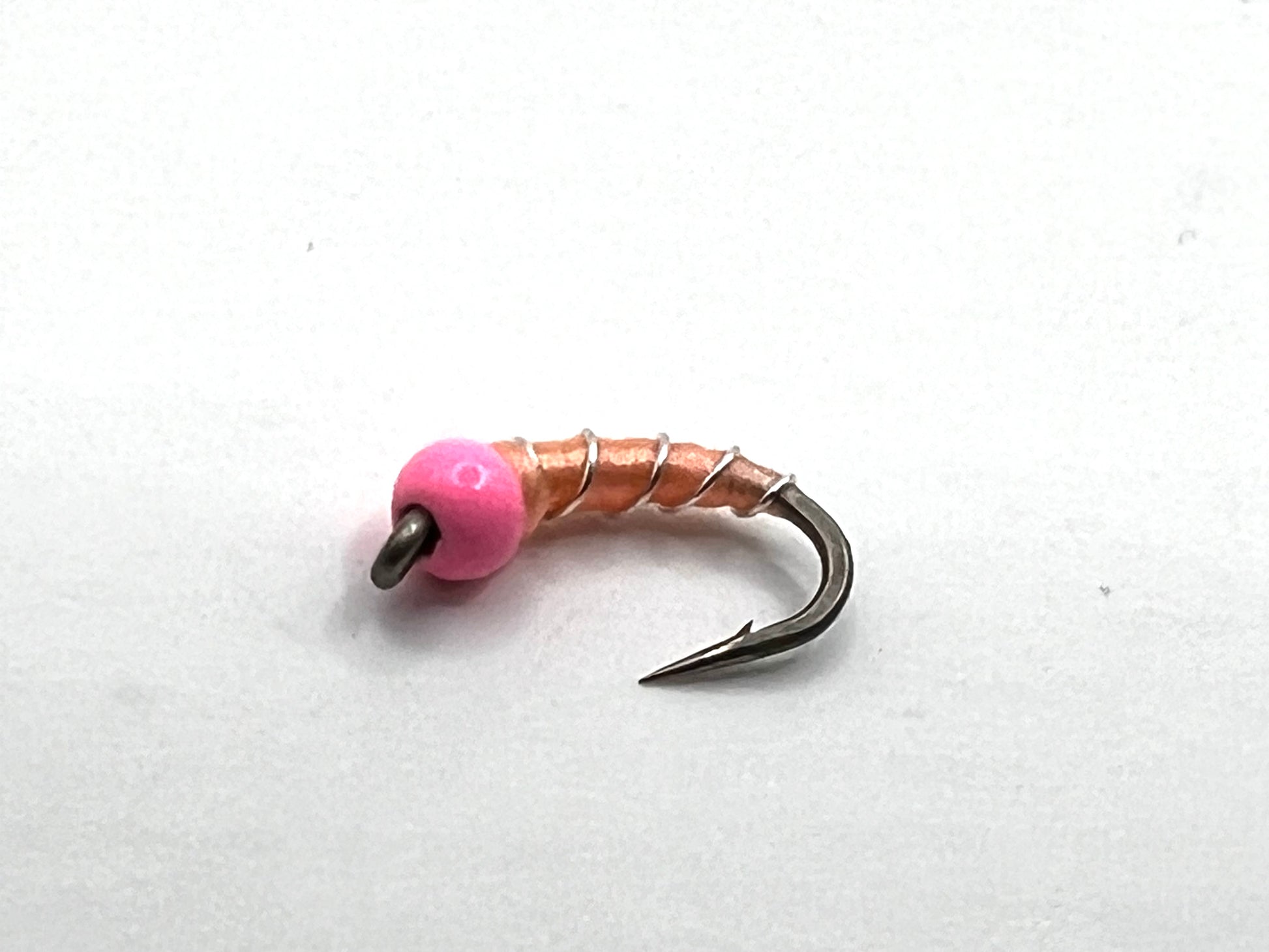 These size 18 pink zebra midges feature light pink tungbeads, silver wire and fluorescent shell pink thread