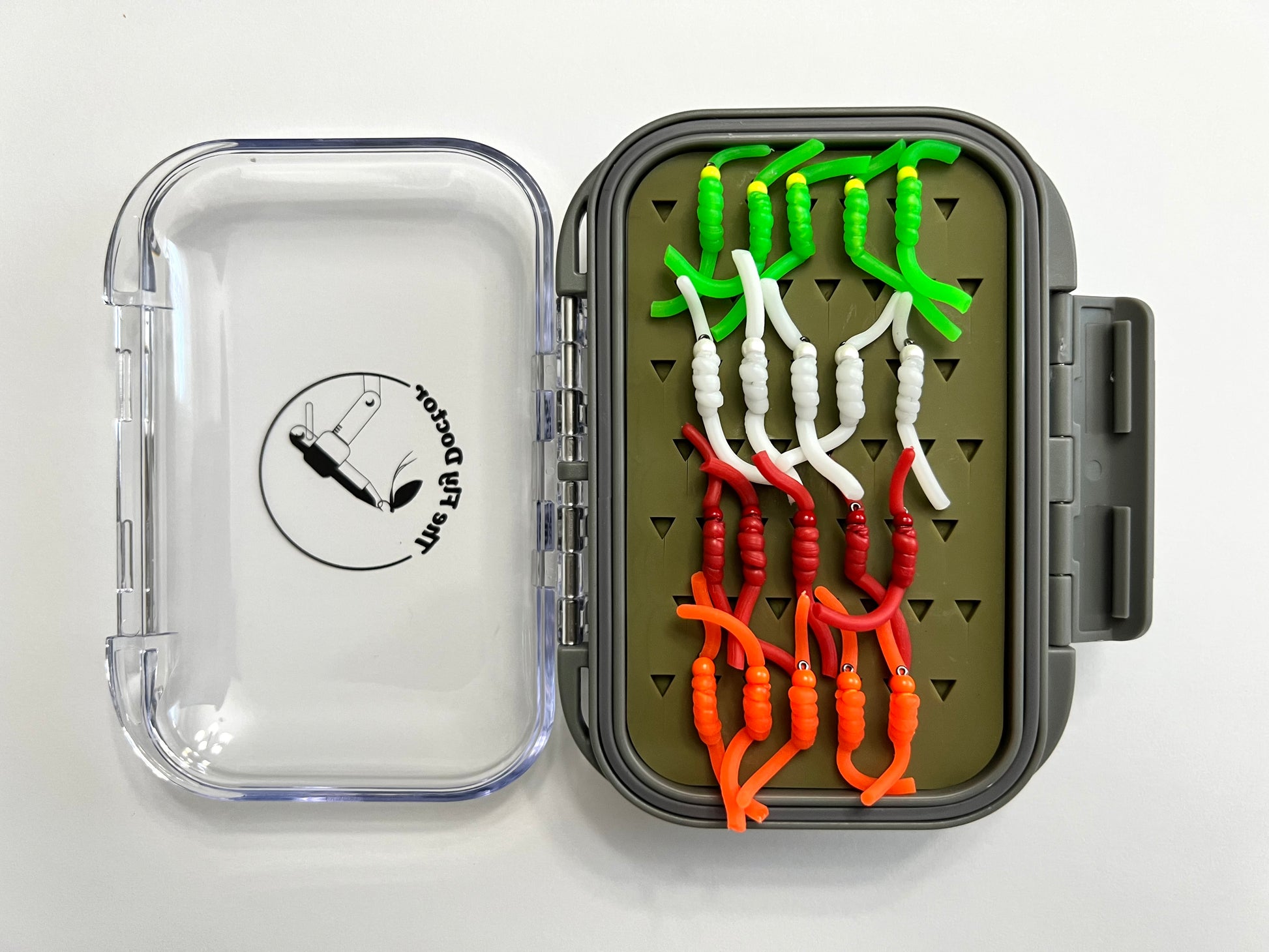This 4 x 2 3/4" x 1 1/2" double-sided silicone Tungsten Squirmy Fly Box holds the following 40 Squirmies (all made with tungsten beads and size 14 hooks):